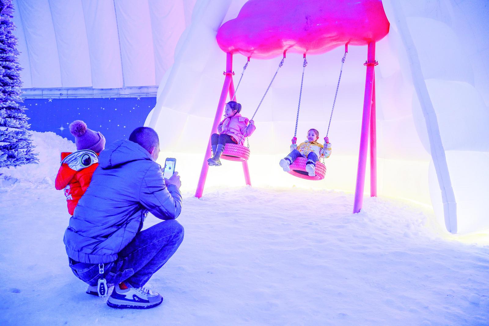 1月11日,在沙坡头旅游景区沙漠星空冰雪乐园场馆里,家长与孩子体验冰雪游玩的快乐。