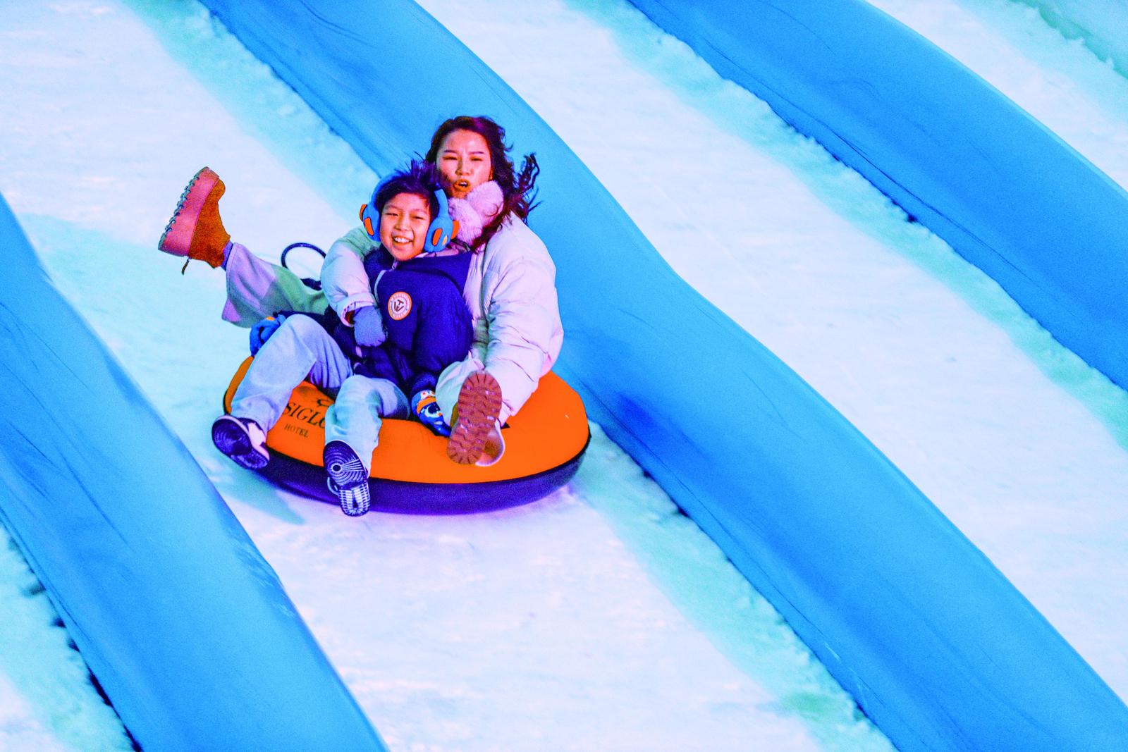 家长与孩子一同体验冰雪项目。