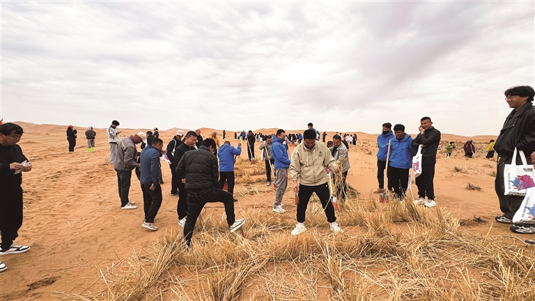 3月29日,“共扎草方格·筑牢绿长城”大漠公益行在沙坡头旅游景区举行。来自河北、山东、山西、河南等地的旅行社团队游客,以及宁夏本地的市民与游客共同走进沙漠,用双手扎设麦草方格,参与防沙治沙实践。