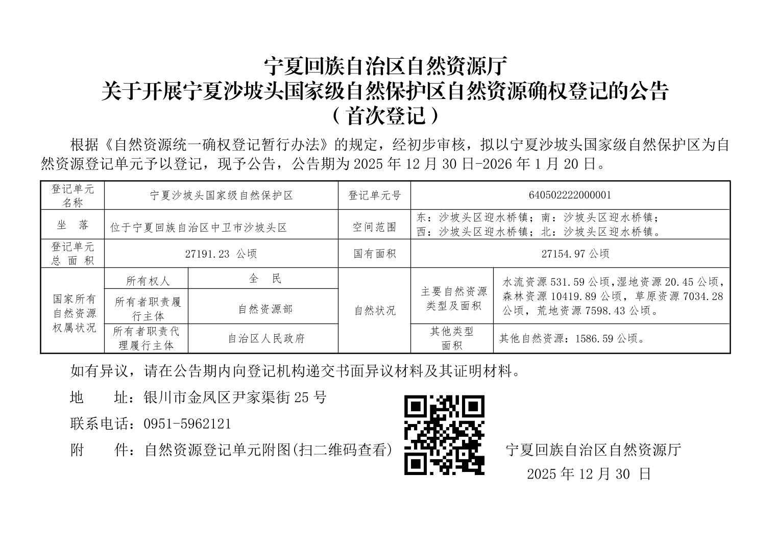 宁夏回族自治区自然资源厅关于开展宁夏沙坡头国家级自然保护区自然资源确权登记的公告 (首次登记)