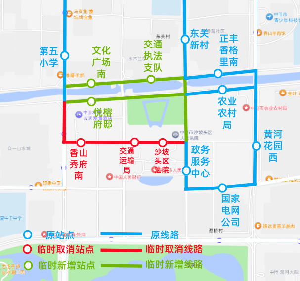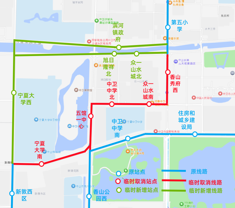 西线:滨河首末站—中卫党校—新敦西D区—新敦西区—宁夏大学西—旭日隆祥北—众一山水城北—第五小学—(其他站点不变)—滨河首末站。