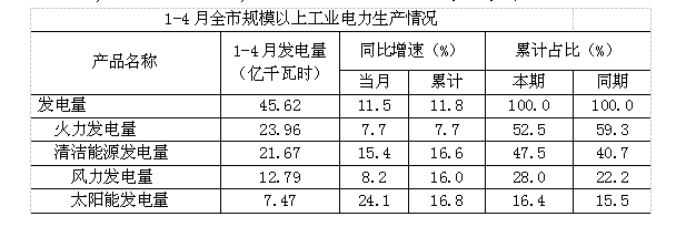 1-4月,全市规模以上工业发电量增速回落,清洁能源发电量占比提高,发电结构持续优化。