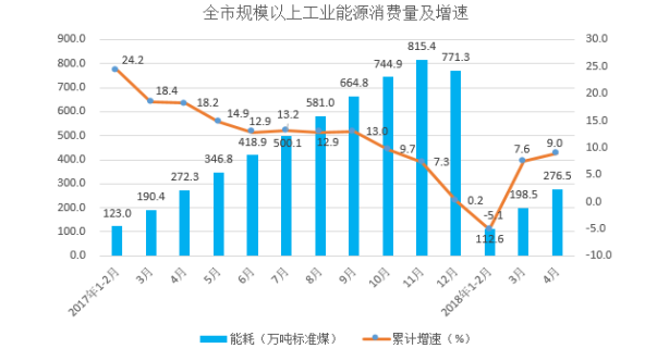 1-4月,全市规上工业能源消费量同比增长9.0%,市属规上工业总产值增长4.1%,能耗增速自2017年初以来首次超越产值增速。