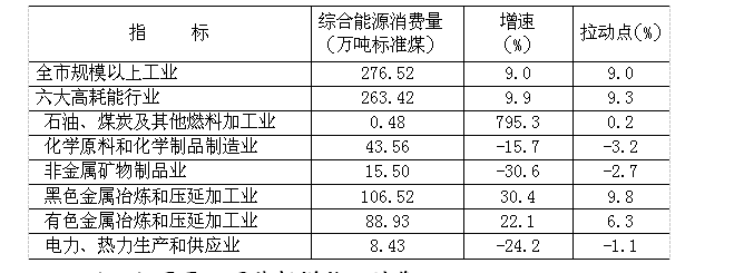 1-4月,全市规上工业六大高耗能行业能源消费量263.42万吨标准煤,同比增长9.9%,占全市规上工业能源消费量的95.3%,拉动全市规上工业能耗增长9.3个百分点。具体能耗情况见下表: