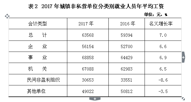 从单位执行会计标准类别来看,城镇非私营企业与机关、事业单位平均工资差距不大。2017年,城镇非私营企业单位平均工资56154元,与全市平均工资水平相比少7414元,比上年增长6.6%;事业单位年平均工资68858元,比全市平均工资水平多5290元,比上年增长6.9%;机关单位67088元,比全市平均工资水平多3520元,比上年增长6.5%(详见表2)。