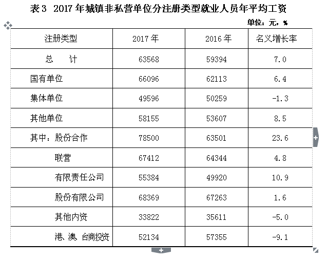 从单位注册类型来看,股份合作企业年平均工资最高。2017年,股份合作企业年平均工资为78500元,是全市平均水平的1.23倍;其次是联营企业年平均工资67412元,是全市平均水平的1.06倍;第三位是国有单位年平均工资66096元,是全市平均水平的1.04倍。年平均工资水平最低的是其他内资企业33822元,仅占全市平均水平的53.2%(详见表3)。