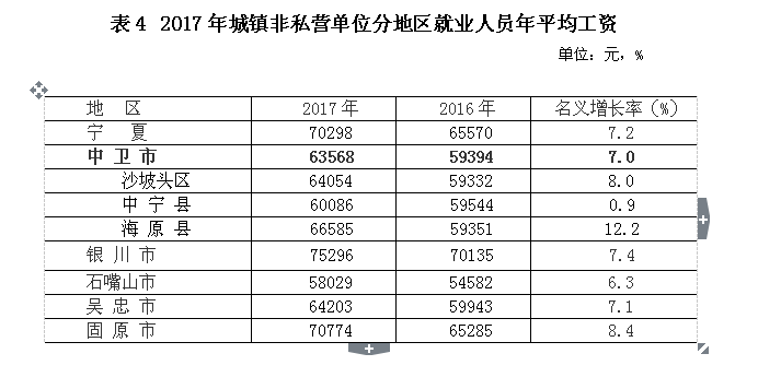 分县区看,非私营单位海原县工资水平最高,中宁县工资水平最低。2017年,城镇非私营单位平均工资由高到低分别为海原县66585元、沙坡头区64054元、中宁县60086元。工资水平在全区22个县区中,海原县列第12位,比上年前移2位;沙坡头区居第14位,比上年前移1位;中宁县居第16位,比上年后移3位(详见表4)。