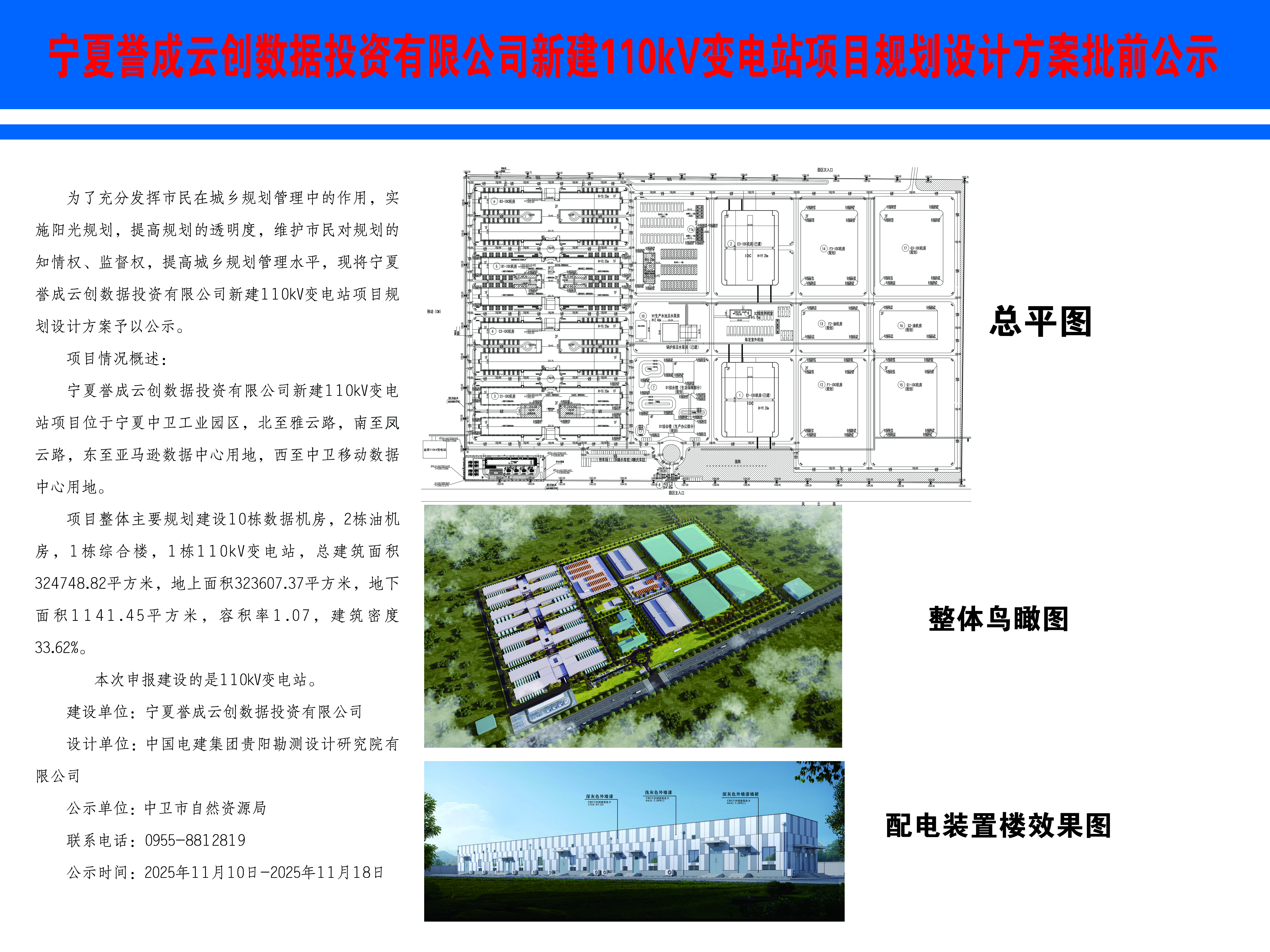 宁夏誉成云创数据投资有限公司新建110kV变电站项目规划设计方案批前公示